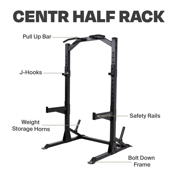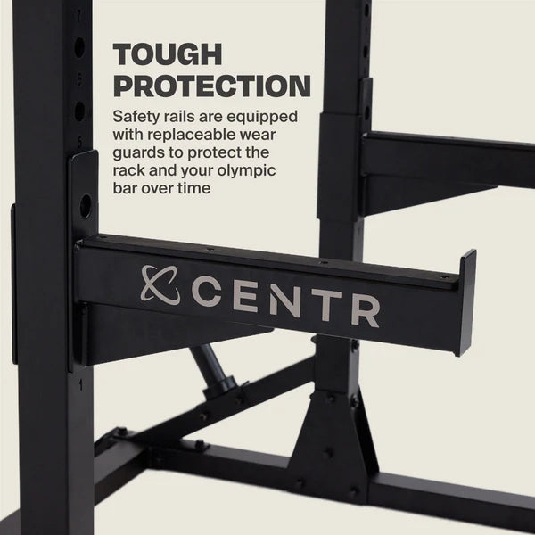 The Centr Half Rack is fully loaded with a vertical bar catch and safety rail adjustment. Adjust to fit your needs with 16 positions in standing, kneeling, and seated exercises. The bar catches and safety rails come with replaceable wear guards to protect the rack and your olympic bar. And, the dual 10”(25.4cm) weight storage horns can store 5 to 10 weight plates depending on their width.