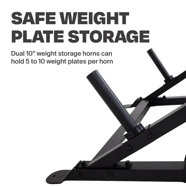 Storage Dual 10 - inch (254mm) weight storage horns with rubber bumpers allow for between 5 to 10 weight plates per horn depending on the width of Weight plates.