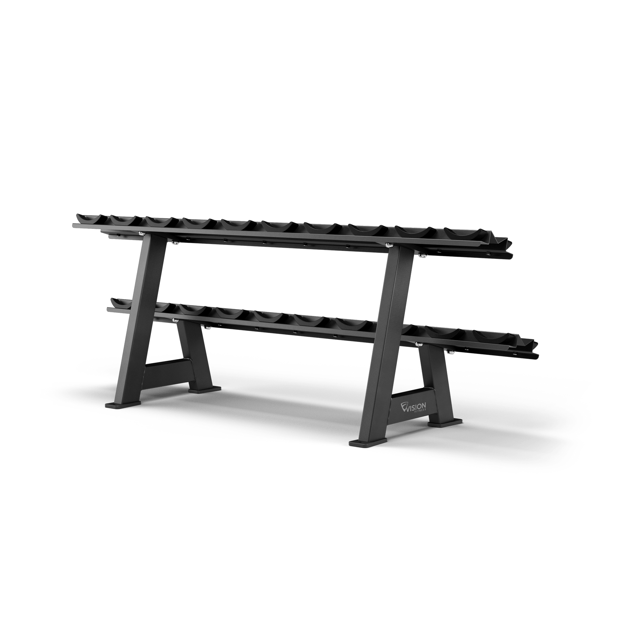 Make sure your dumbbells are out of the way and easy to access with Vision stable, ultra-durable dumbbell rack. It stores up to 10 pairs of dumbbells in secure cradles that are angled to make picking up and putting back weights easy and comfortable. It also features the kind of heavy-duty construction and design details that will keep it looking like new for years, even in the busiest fitness facilities.