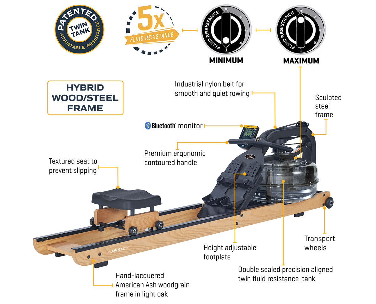 Defining the realms of user convenience, the Apollo V Indoor Rower is complete with Bluetooth auto-adjust technology that instinctively correlates selected tank resistance with the console display, and is compatible with FDF’s Fluid Workout social app.