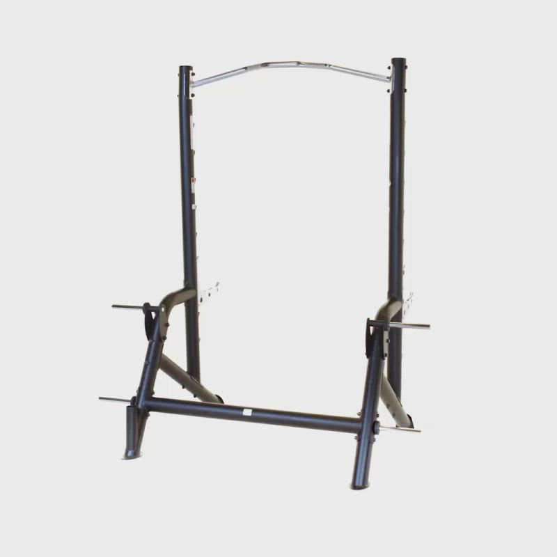 A Squat Rack with pull up bar, spotter arms, Olympic bar & weight plate storage.